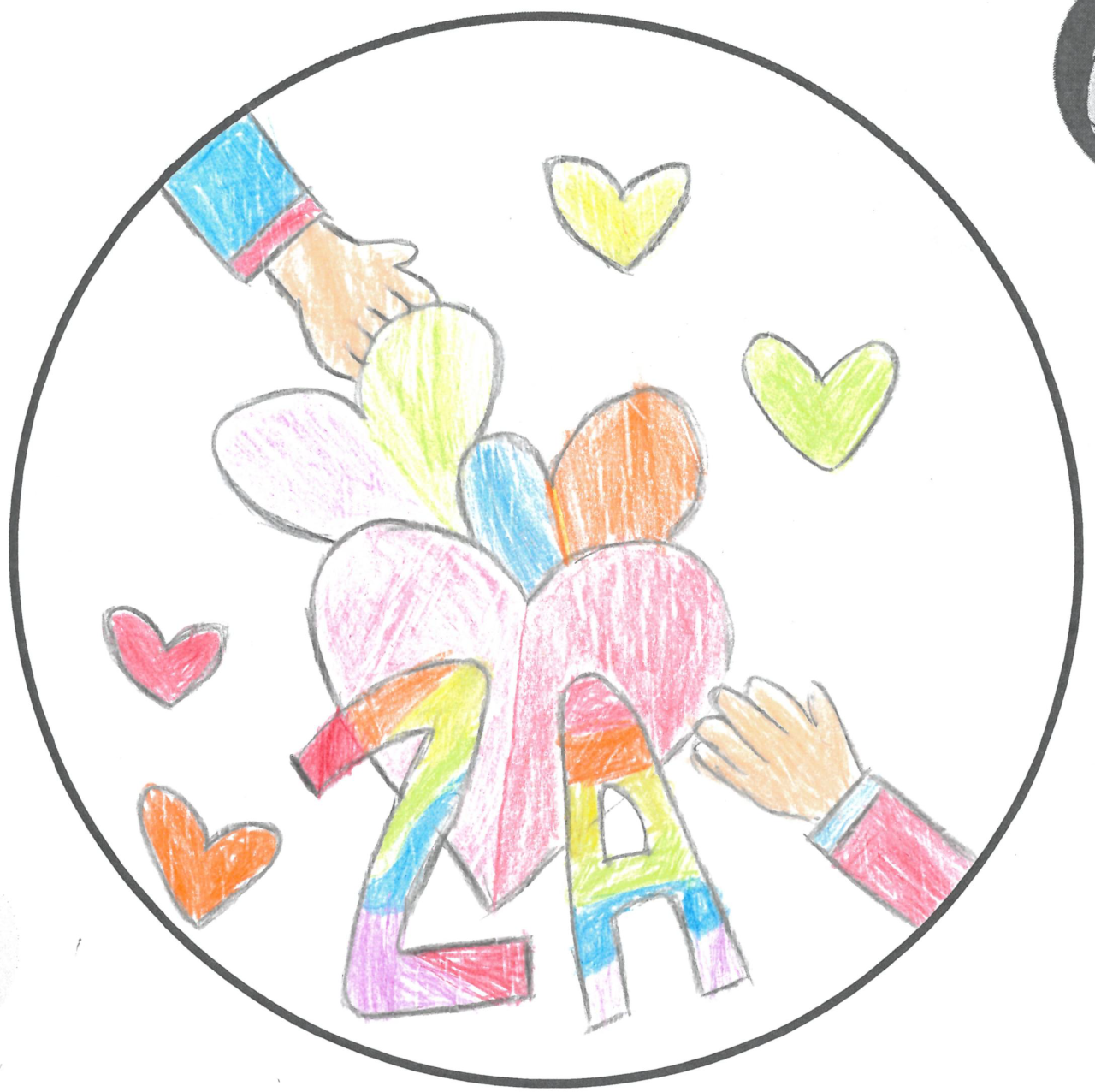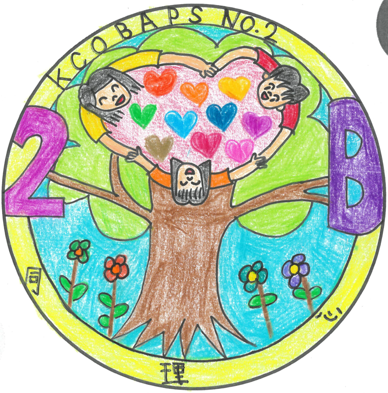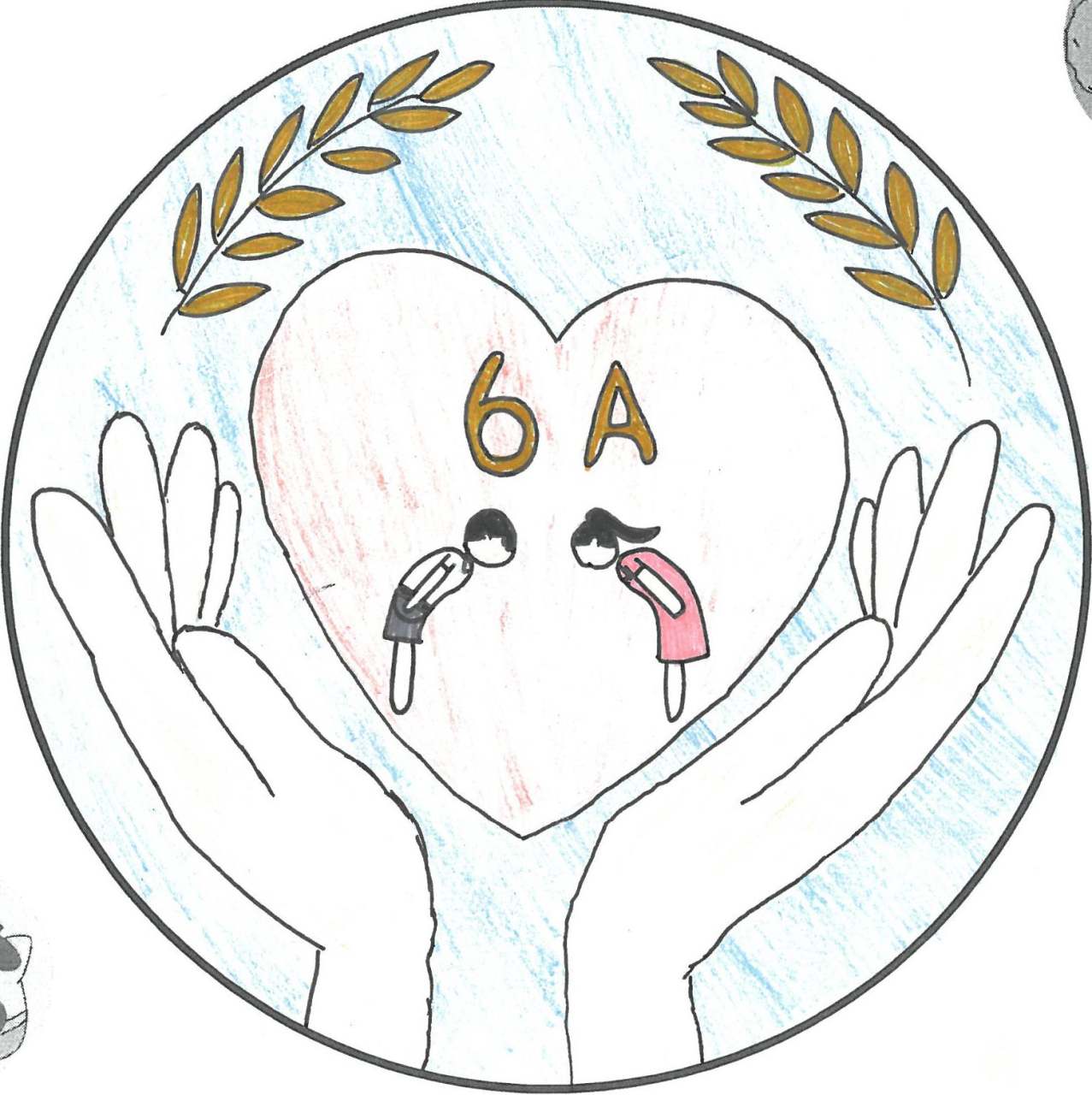 雙手拿着一顆心,心形裏有「6A」和英二學生互相鞠躬(象徵尊重)。心形上方兩側有橄欖枝(象徵包容),主色是藍色、紅色和金色(象徵信任、同理心和溫暖)。