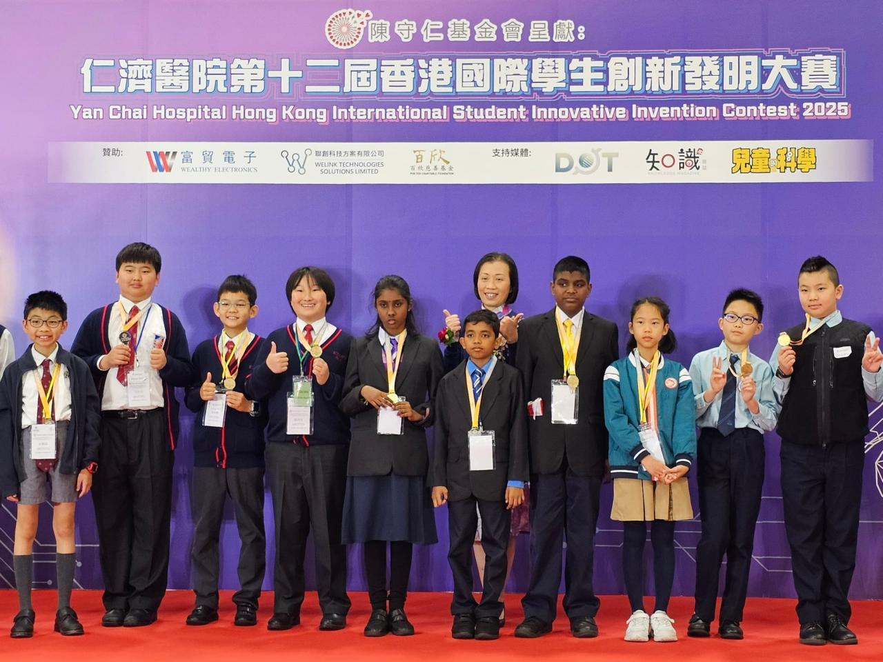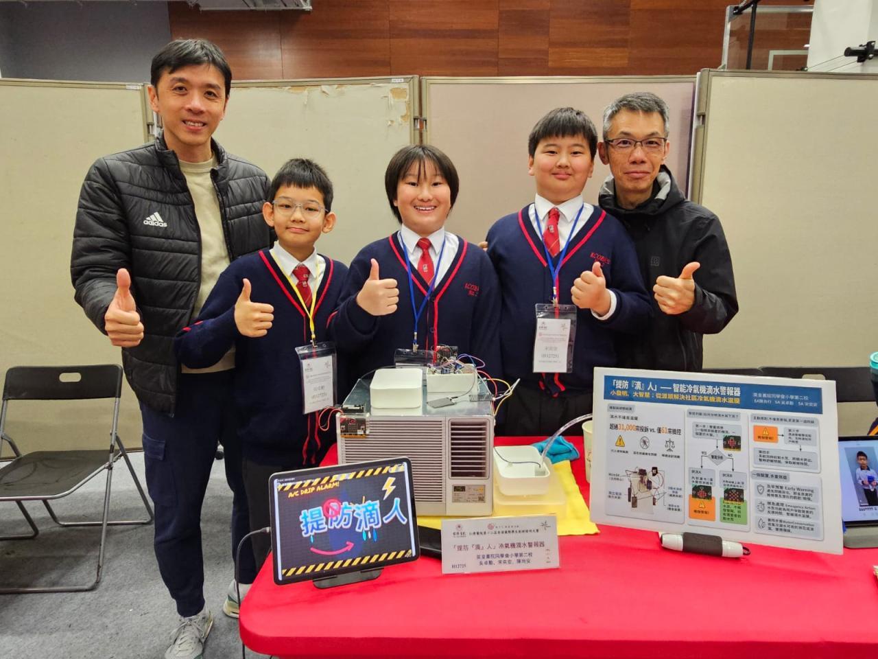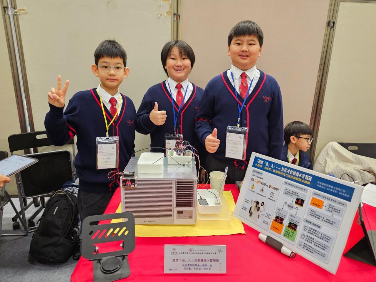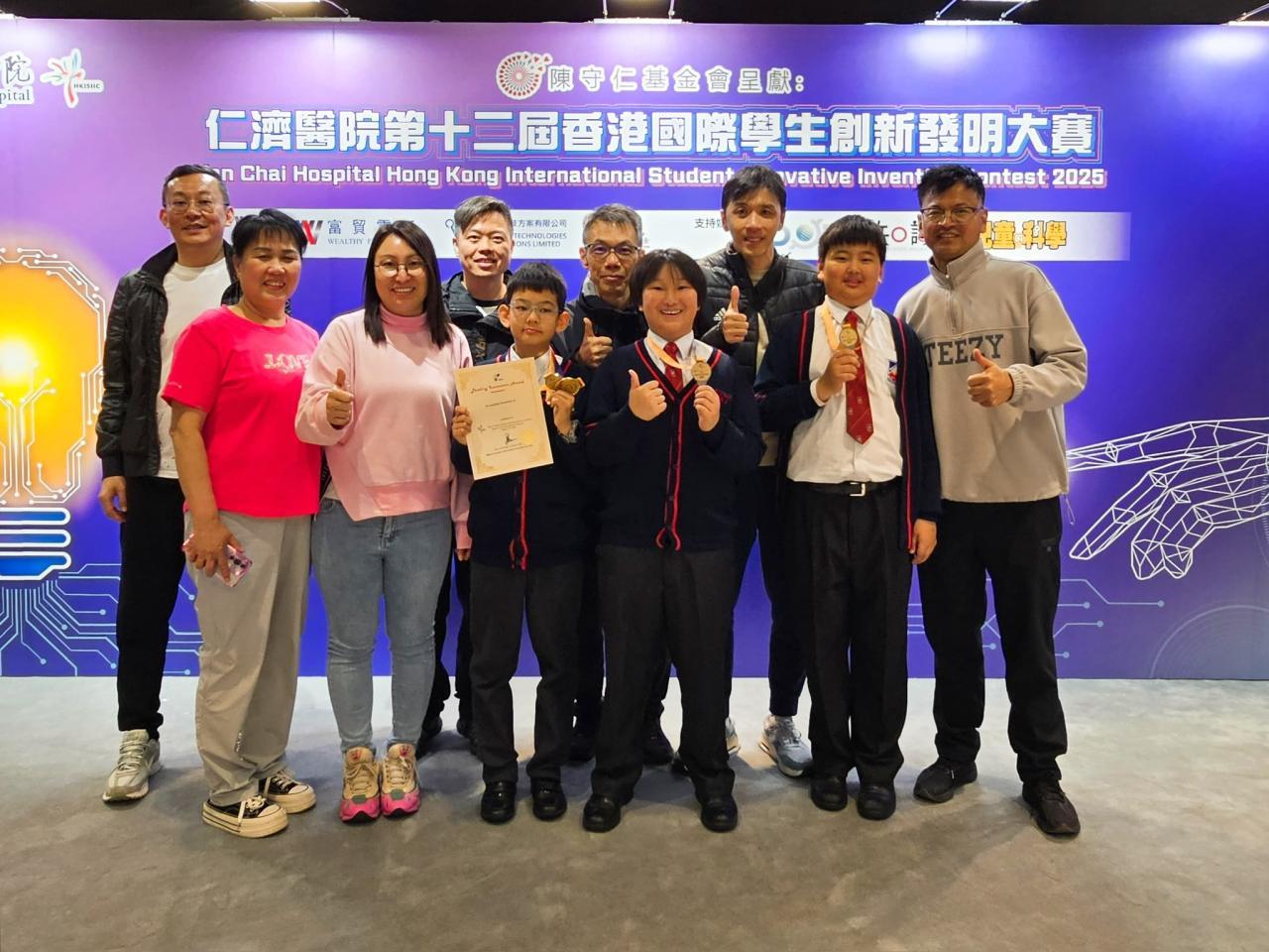 比賽日期: 2026年3月14日 本校學生陳尚行、吳卓勳、宋奕安於「仁濟醫院第十二屆香港國際學生創新發明大賽」中,憑藉「提防『滴』人:冷氣滴水警報器」獲得高小組銀獎及國際特別獎項(澳門)。三位同學在比賽期間合作無間,運用運算思維和steam知識,創作出一個能實際幫助解決社區問題的發明品,展現了學以致用、貢獻社群的精神。希望他們繼續努力鑽研相關知識,將來在科技發明領域發光發亮。| 組別 | 姓名 | 班別 | 學號 | 獎項 |