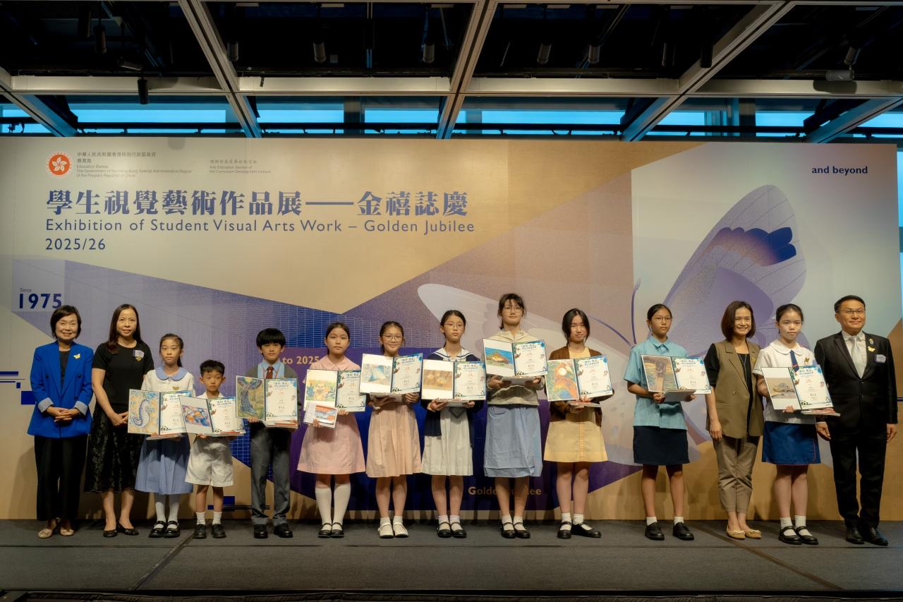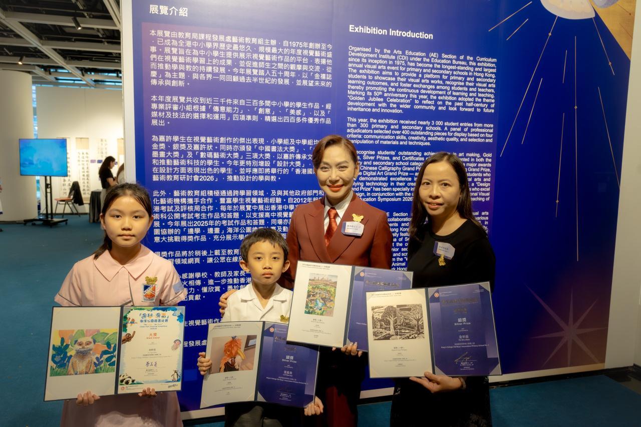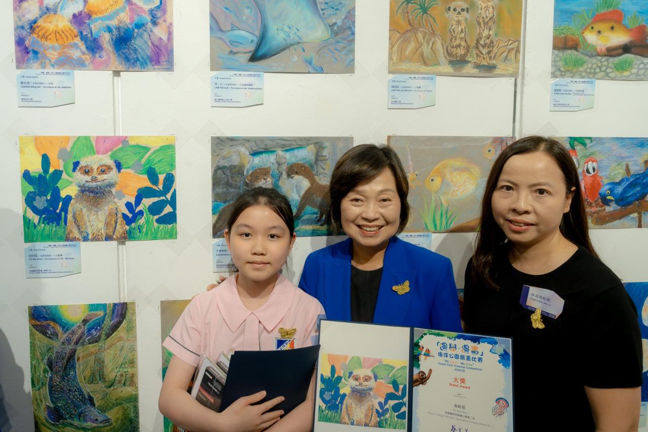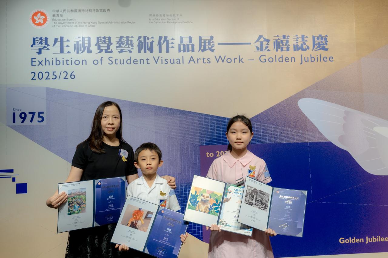 活動日期:26年4月17日 地點:香港大會堂 恭喜本校俞昕辰同學和雷晨熹同學分別在教育局課程發展處藝術教育組主辦,全港中小學界歷史最悠久、規模最大的年度視覺藝術盛事「學生視覺藝術作品展」中,分別榮獲三項銀獎。 而俞昕辰同學更在由教育局及海洋公園主辦的「邊學‧邊畫海洋公園繪畫比賽」中勇奪「大獎」(是次比賽的最高獎項),並在教育局蔡若蓮局長手中接獲獎項。 俞昕辰同學和雷晨熹同學得獎作品會向公眾展出,展覽即日起至4月29日於香港大會堂舉行,歡迎大家親臨參觀,一同欣賞同學佳作。| 組別 | 姓名 | 班別 | 學號 | 獎項 |