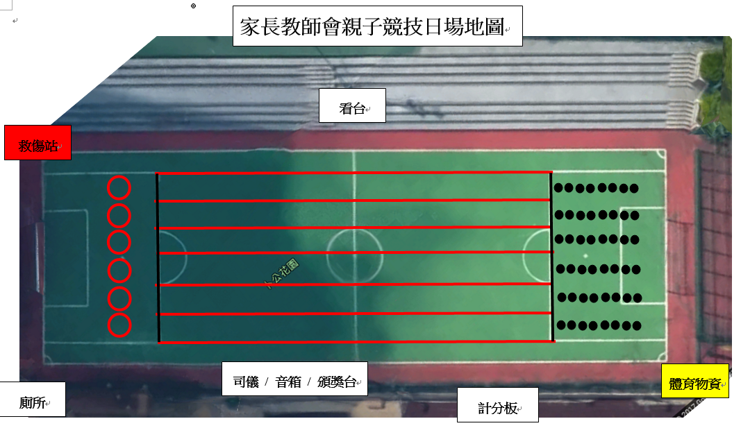 1. 每隊由一對學生與家長組成,各隊分別有一組站在起點,另一組則在拆返線,另外8組學生與家長依序排列於起點與終點之間。