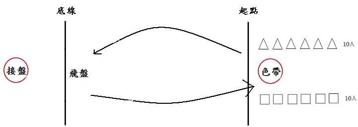 4. 成功接盤後則放下色帶計算一分,然後二人一起手拉手跑回起點線。(接不到重做直到接到)