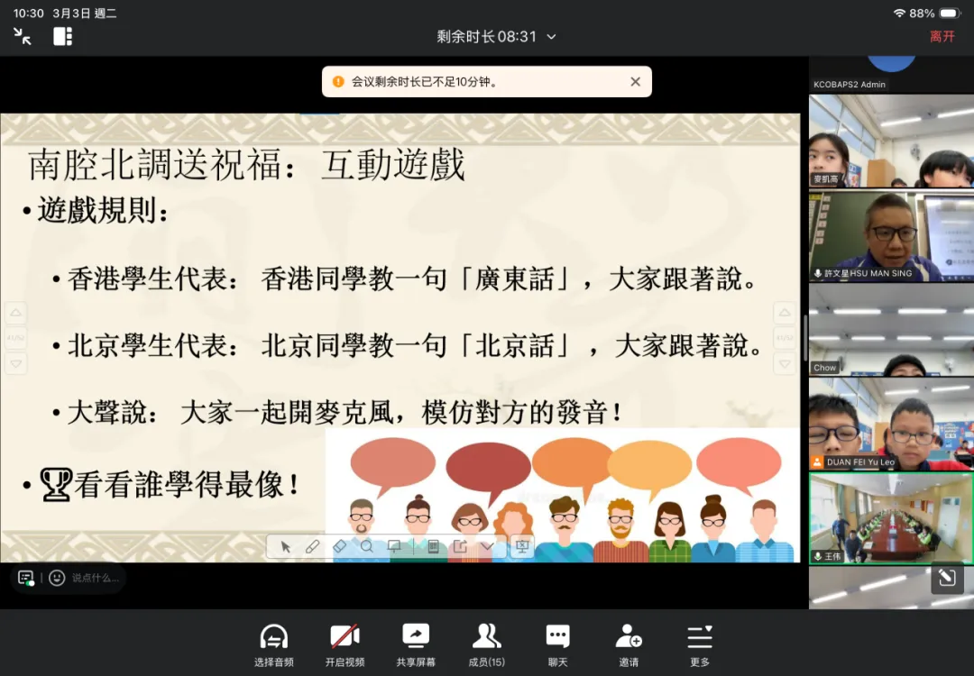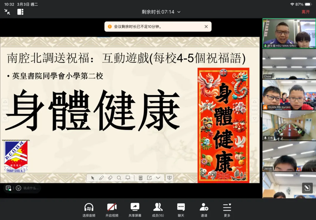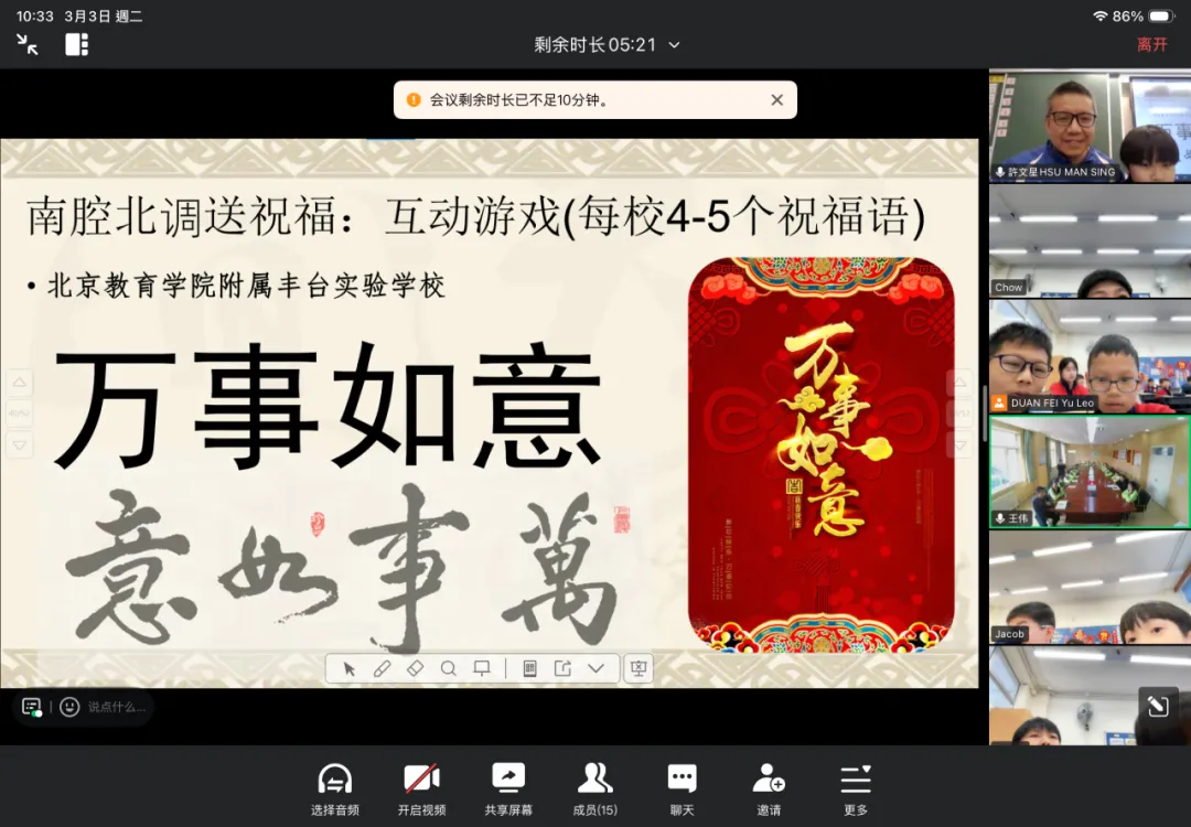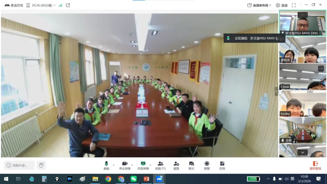 2026年3月3日元宵佳節,我校與北京姊妹學校(北京教育學院附屬豐台實驗學校)跨越千里,透過雲端視訊展開了一場意義非凡的文化交流活動。兩校共60名師生齊聚線上,共話情誼。 【互鑑互賞,認識校園】 活動伊始,兩校師生以燦爛笑容定格拍攝「雲端大合照」。隨後,我校許文星主任與學生代表林昕嵐向姊妹校重點介紹了學校的價值觀教育、正向教育及資優教育特色,讓兩地師生對彼此的辦學理念有了更深的認識。 【南北對話,感受文化】 在文化分享環節,我校翟瑞芬主任與學生代表黃昱迪生動介紹了香港逛花市、派利是及舞龍舞獅等傳統習俗;北京姊妹學校的學生則分享了北方守歲與包餃子的趣事。一南一北,展現了中華文化的博大精深。 【互動祝福,情誼升溫】 在「南腔北調」遊戲中,兩校同學互相教授粵語與普通話祝福語。雖然發音稚嫩,卻傳遞了最真摯的情誼。此次活動不僅增進了兩校友誼,更增強了學生的民族認同感。期待未來兩校能持續交流,攜手成長!