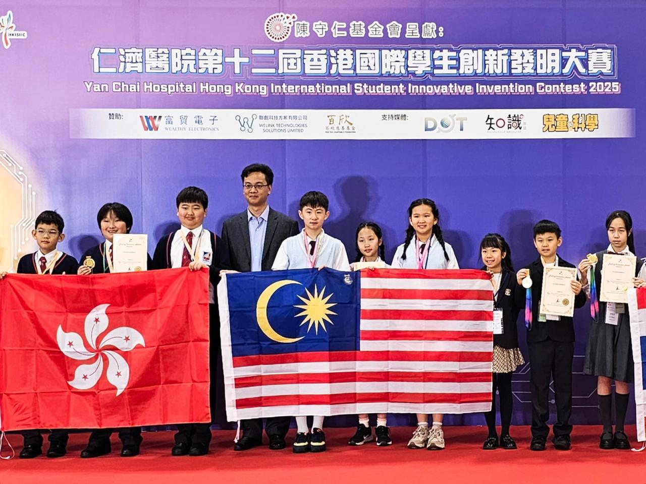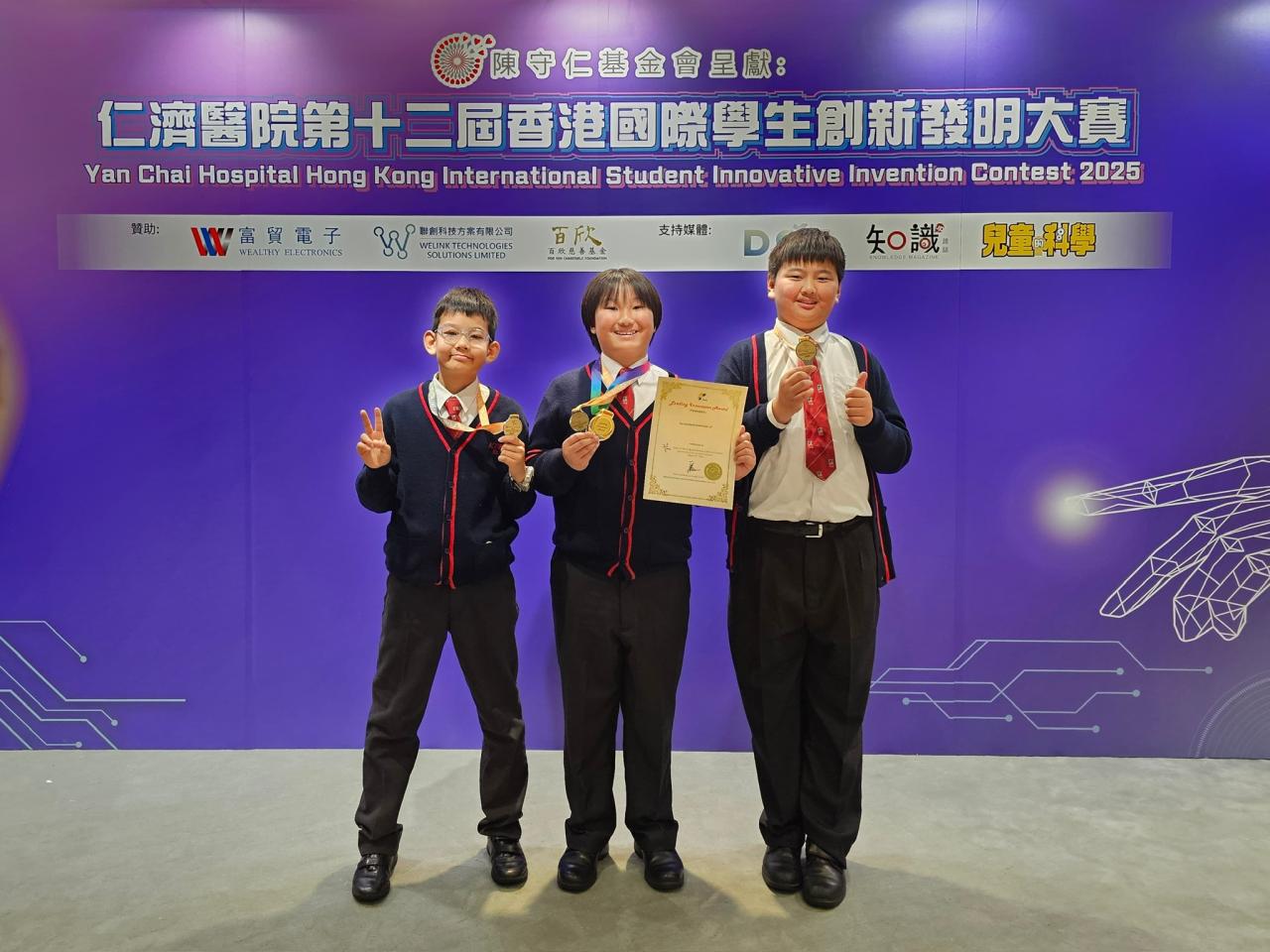 比賽日期: 2026年3月14日 本校學生陳尚行、吳卓勳、宋奕安於「仁濟醫院第十二屆香港國際學生創新發明大賽」中,憑藉「提防『滴』人:冷氣滴水警報器」獲得高小組銀獎及國際特別獎項(澳門)。三位同學在比賽期間合作無間,運用運算思維和steam知識,創作出一個能實際幫助解決社區問題的發明品,展現了學以致用、貢獻社群的精神。希望他們繼續努力鑽研相關知識,將來在科技發明領域發光發亮。| 組別 | 姓名 | 班別 | 學號 | 獎項 |