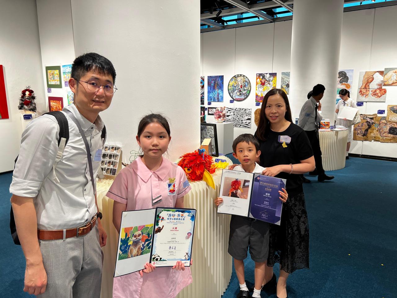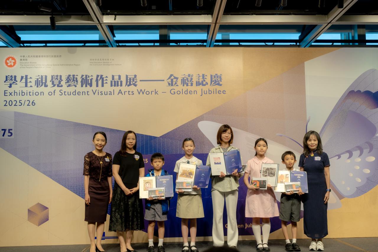 活動日期:26年4月17日 地點:香港大會堂 恭喜本校俞昕辰同學和雷晨熹同學分別在教育局課程發展處藝術教育組主辦,全港中小學界歷史最悠久、規模最大的年度視覺藝術盛事「學生視覺藝術作品展」中,分別榮獲三項銀獎。 而俞昕辰同學更在由教育局及海洋公園主辦的「邊學‧邊畫海洋公園繪畫比賽」中勇奪「大獎」(是次比賽的最高獎項),並在教育局蔡若蓮局長手中接獲獎項。 俞昕辰同學和雷晨熹同學得獎作品會向公眾展出,展覽即日起至4月29日於香港大會堂舉行,歡迎大家親臨參觀,一同欣賞同學佳作。| 組別 | 姓名 | 班別 | 學號 | 獎項 |