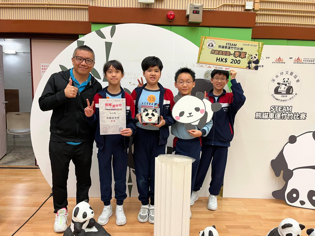 比賽日期: 2026年1月18日 本校學生於校外比賽再創佳績!在2026年1月18日(星期日),本校的機械人代表隊,參加了由深水埗文藝協會主辦的「STEAM熊貓機械人競技大賽」。 本次比賽於荔枝角社區會堂舉行 。本校代表隊在比賽中全情投入,展現了出色的合作精神與STEAM素養。由 6A班 林子艅、馬康賢、武子祿 及 6B班 陳子皓組成的隊伍表現優異,他們憑藉精心設計的機械人造型,在眾多參賽隊伍中脫穎而出,最終勇奪 「外觀造型獎」季軍 。 是次獲獎充分展現了英二同學在科創領域的創意與實踐能力,實在值得欣賞和慶賀!希望同學們能保持這份熱誠,在未來的STEAM活動中繼續發揮創意,爭取更卓越的成就。| 組別 | 姓名 | 班別 | 學號 | 獎項 |