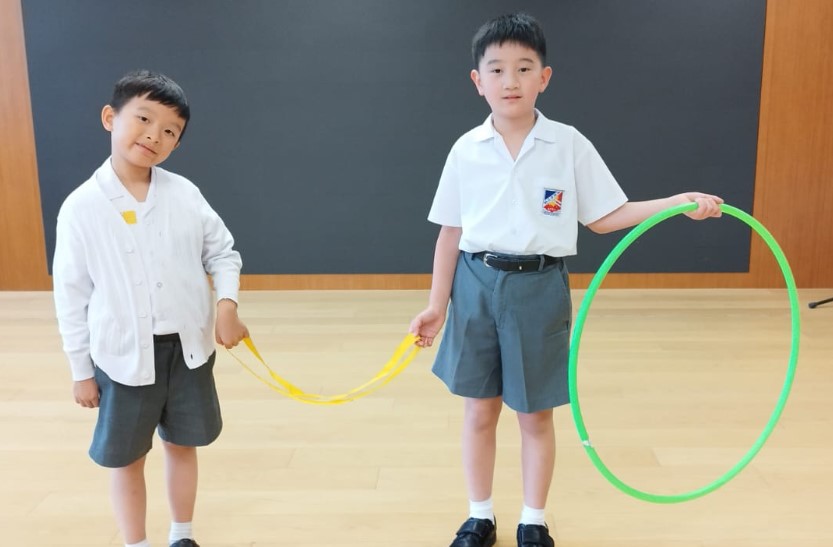 2. 家長和學生出發前利用中間手合力拿著一條色帶,其中一人的另一隻手拿著一個膠圈。(見相)