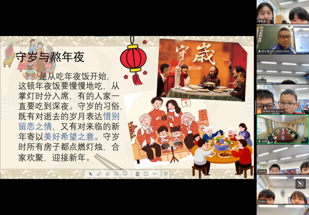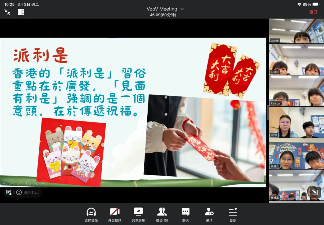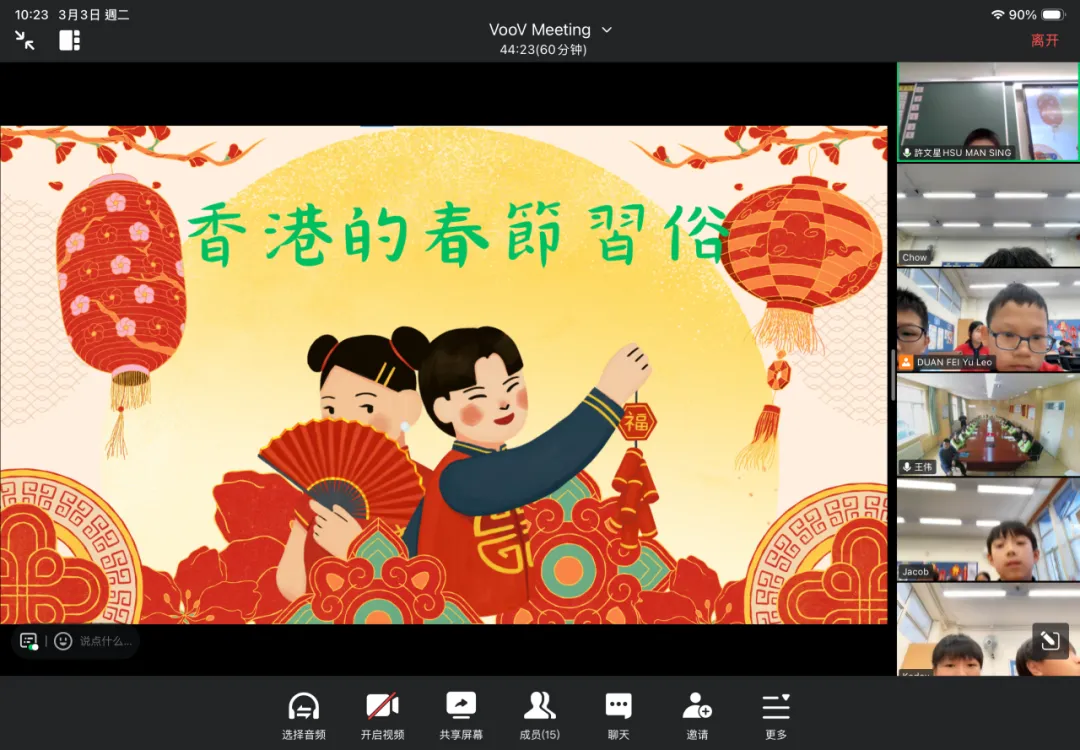 2026年3月3日元宵佳節,我校與北京姊妹學校(北京教育學院附屬豐台實驗學校)跨越千里,透過雲端視訊展開了一場意義非凡的文化交流活動。兩校共60名師生齊聚線上,共話情誼。 【互鑑互賞,認識校園】 活動伊始,兩校師生以燦爛笑容定格拍攝「雲端大合照」。隨後,我校許文星主任與學生代表林昕嵐向姊妹校重點介紹了學校的價值觀教育、正向教育及資優教育特色,讓兩地師生對彼此的辦學理念有了更深的認識。 【南北對話,感受文化】 在文化分享環節,我校翟瑞芬主任與學生代表黃昱迪生動介紹了香港逛花市、派利是及舞龍舞獅等傳統習俗;北京姊妹學校的學生則分享了北方守歲與包餃子的趣事。一南一北,展現了中華文化的博大精深。 【互動祝福,情誼升溫】 在「南腔北調」遊戲中,兩校同學互相教授粵語與普通話祝福語。雖然發音稚嫩,卻傳遞了最真摯的情誼。此次活動不僅增進了兩校友誼,更增強了學生的民族認同感。期待未來兩校能持續交流,攜手成長!